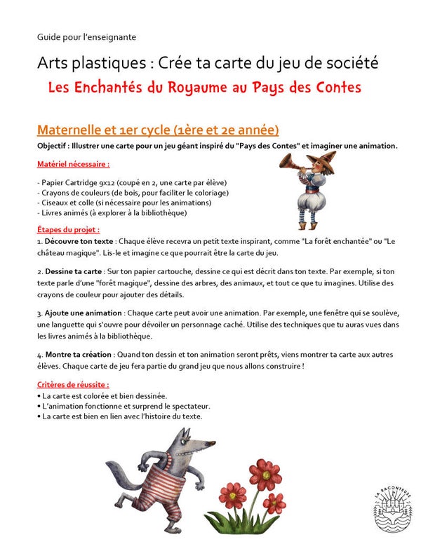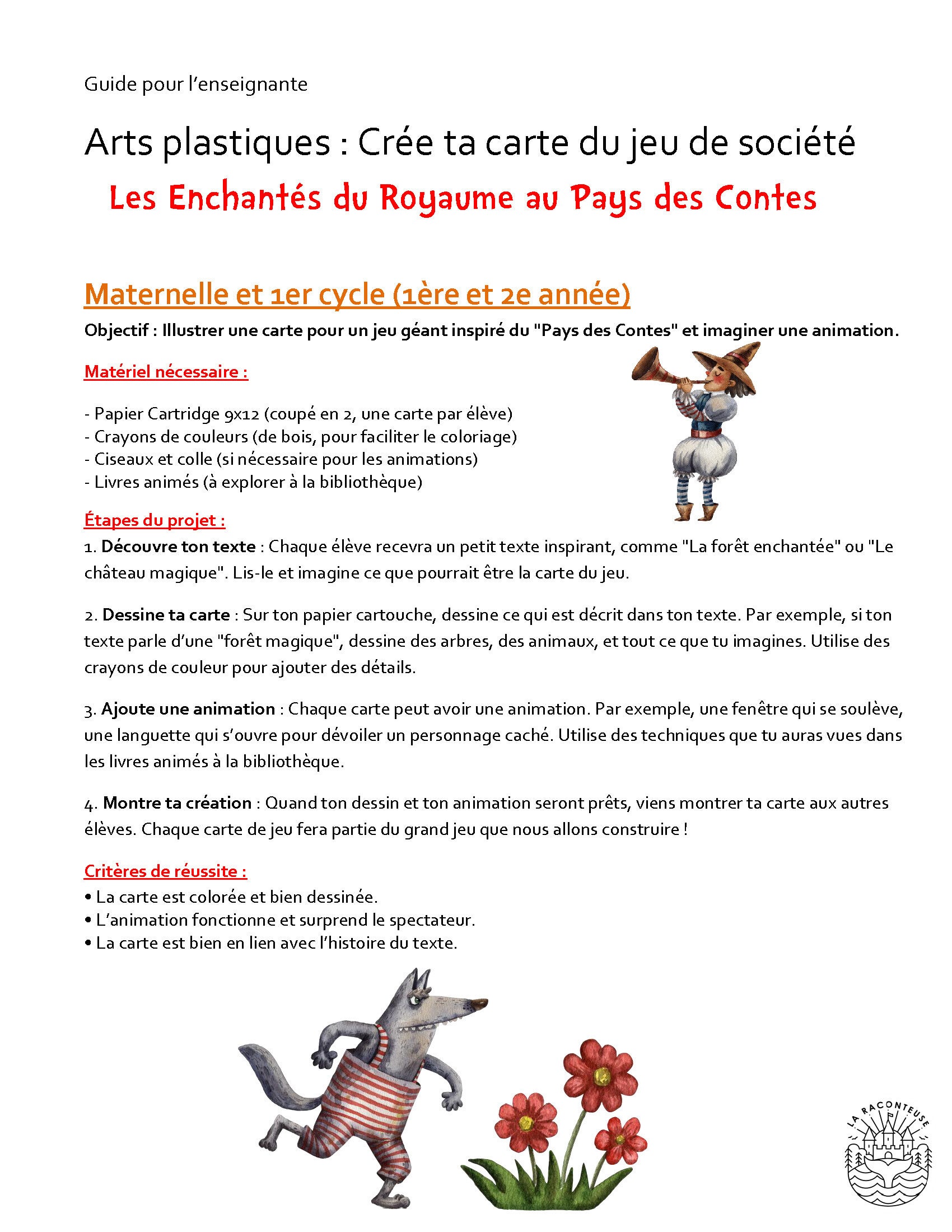 Après réalisation, chaque élève reçoit une page intitulée « Voyage au cœur du Pays des Contes », qui invite à imaginer le jeu à l’échelle de toute l’école et ses retombées interdisciplinaires (langue, maths, sciences, anglais). L’expérience met l’accent sur la créativité, la narration visuelle et la coopération.Grands mercis de m'aider à faire connaître mes travaux en donnant le lien Internet de cette fiche plutôt que la fiche...