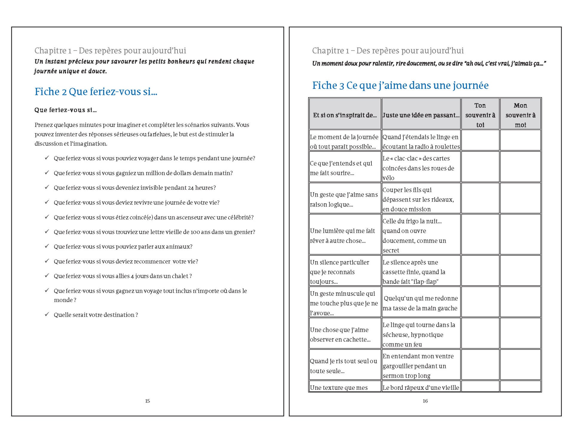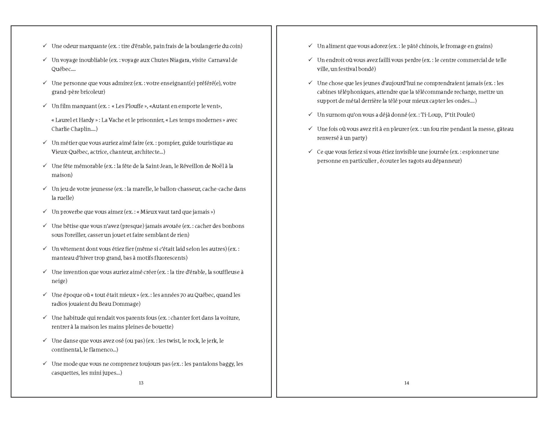 Divisé en 12 chapitres thématiques, il propose 90 fiches d’activités simples, accessibles et souples, qui respectent le rythme, l’état de santé et les capacités de chacun et qui permet de s'amuser à deux avec des questionnaires à double entrée et donnent des sujets de discussion à chaque fois !