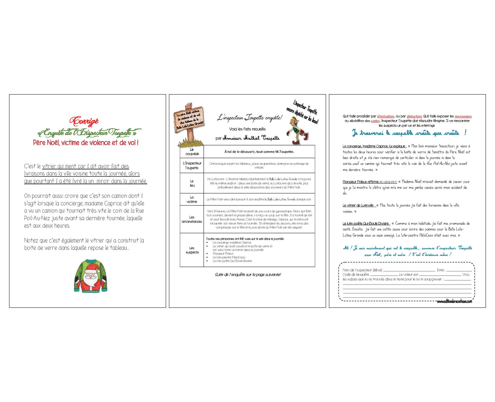 Votre classe est officiellement recrutée par l'inspecteur Toupette ! Le Père Noël a été victime d'un vol audacieux : le tableau de son ancêtre, la célèbre Bella Lola-Lutina Gironde, a disparu. Les élèves devront analyser les indices laissés sur la scène de crime, recueillir les témoignages et utiliser leur sens de la déduction pour démasquer le coupable. Une activité de Noël drôle et captivante, parfaite pour développer la logique et la collaboration ! À faire en équipe ou en grand groupe.